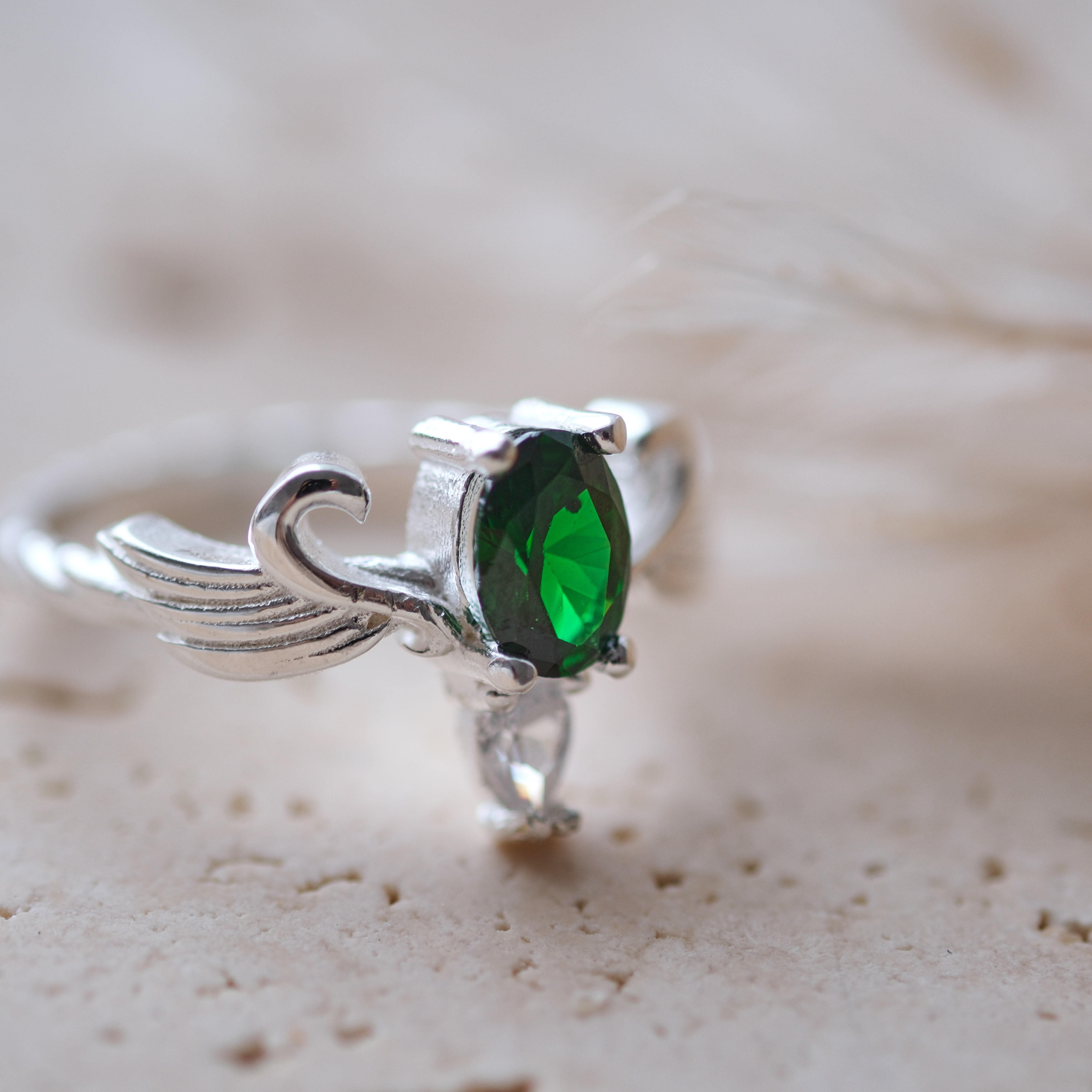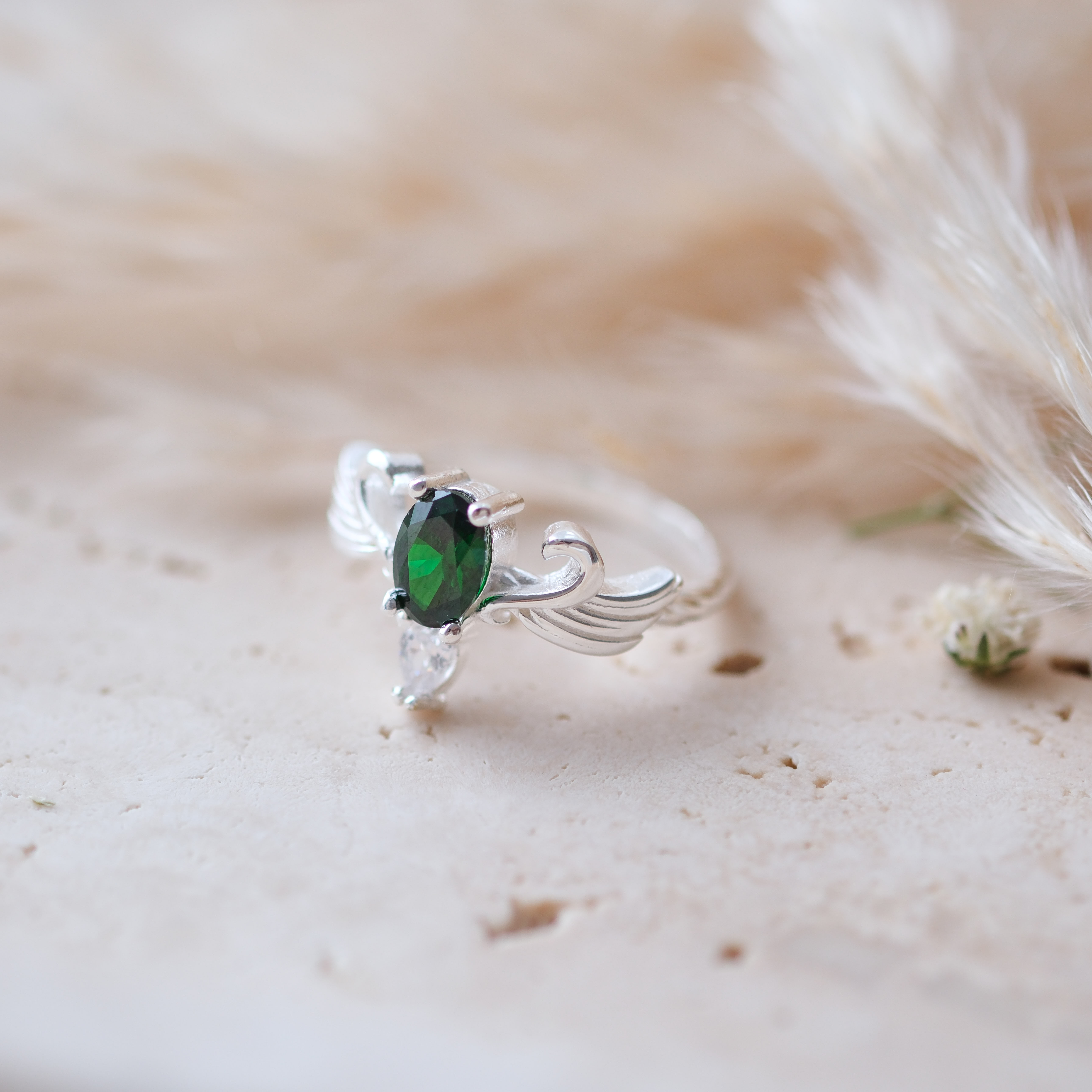 - Büyüklük: Yüzüğün merkezinde yer alan zümrüt taşı, dikkat çekici bir büyüklüğe sahiptir; böylece parmağınızda asla gözden kaçmayacak bir parıltı sunar.